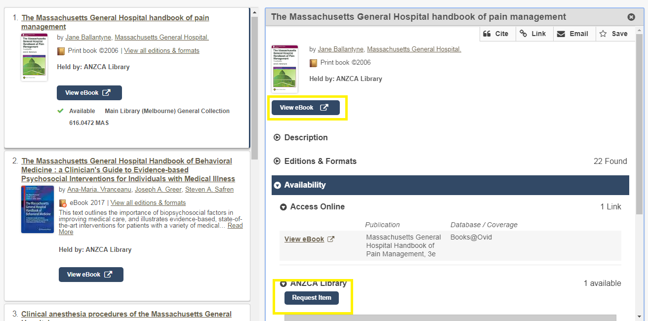 Whilst the vast majority of ANZCA’s library resources show as held, there are some articles that can only be accessed by expanding your search to Libraries Worldwide.